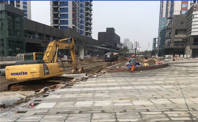 7、室外附屬:居然之家主入口室外附屬全部完成;時尚百貨及弘光路一側(cè)廣場大面積石材鋪貼完成,8#、9#樓一側(cè)室外石材鋪裝大面積完成。居然之家四層屋面鋪裝及綠化施工完畢。A、B區(qū)中間市政道路正在埋管施工中。