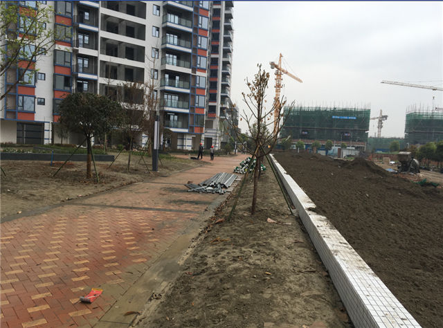 6、室外附屬:小區(qū)內(nèi)人行道區(qū)域面層粘貼全部完成,喬木、灌木已種植,綠化帶內(nèi)正在種植綠籬。小區(qū)外圍正在做面層鋪貼施工。