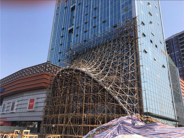 3、酒店:客房內吊頂封板、刮膩子完成,墻面刮膩子、裝飾基層施工完畢,衛(wèi)生間貼墻地磚、玻璃磚隔斷施工完畢。五層早餐區(qū)隔斷施工完畢。外立面幕墻大面積已完成,正在進行入口雨篷施工。