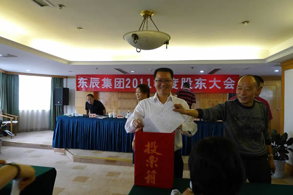 2012年5月11日上午10點,東辰集團(tuán)2011年度股東大會在王子大酒店舉行。近50名股東參加了會議,代表股份1877.8萬股,占公司有表決權(quán)股份總數(shù)的81.73%,符合《中華人民共和國公司法》和本公司章程的有關(guān)規(guī)定。